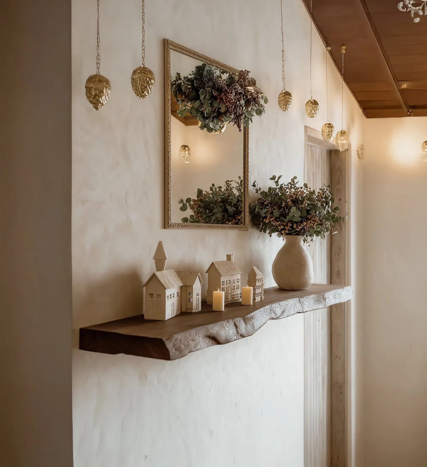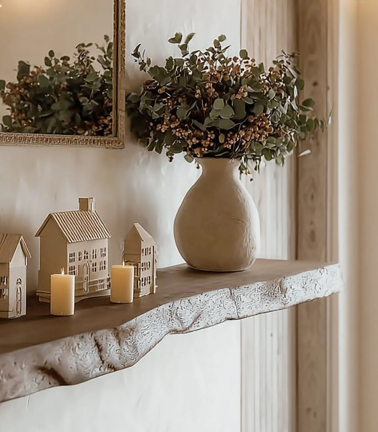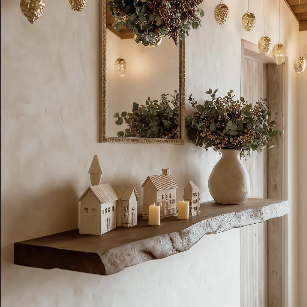 This piece adapts to multiple aesthetics. In Japandi and Scandinavian rooms it becomes a quiet material highlight; in eclectic spaces it ties together leather chairs, woven baskets, and metal lamps with an organic through line. Install with hidden brackets for a floating presentation or use simple metal supports for an honest, utilitarian mood. Seasonal accents keep the composition fresh without adding clutter to floors or tabletops.