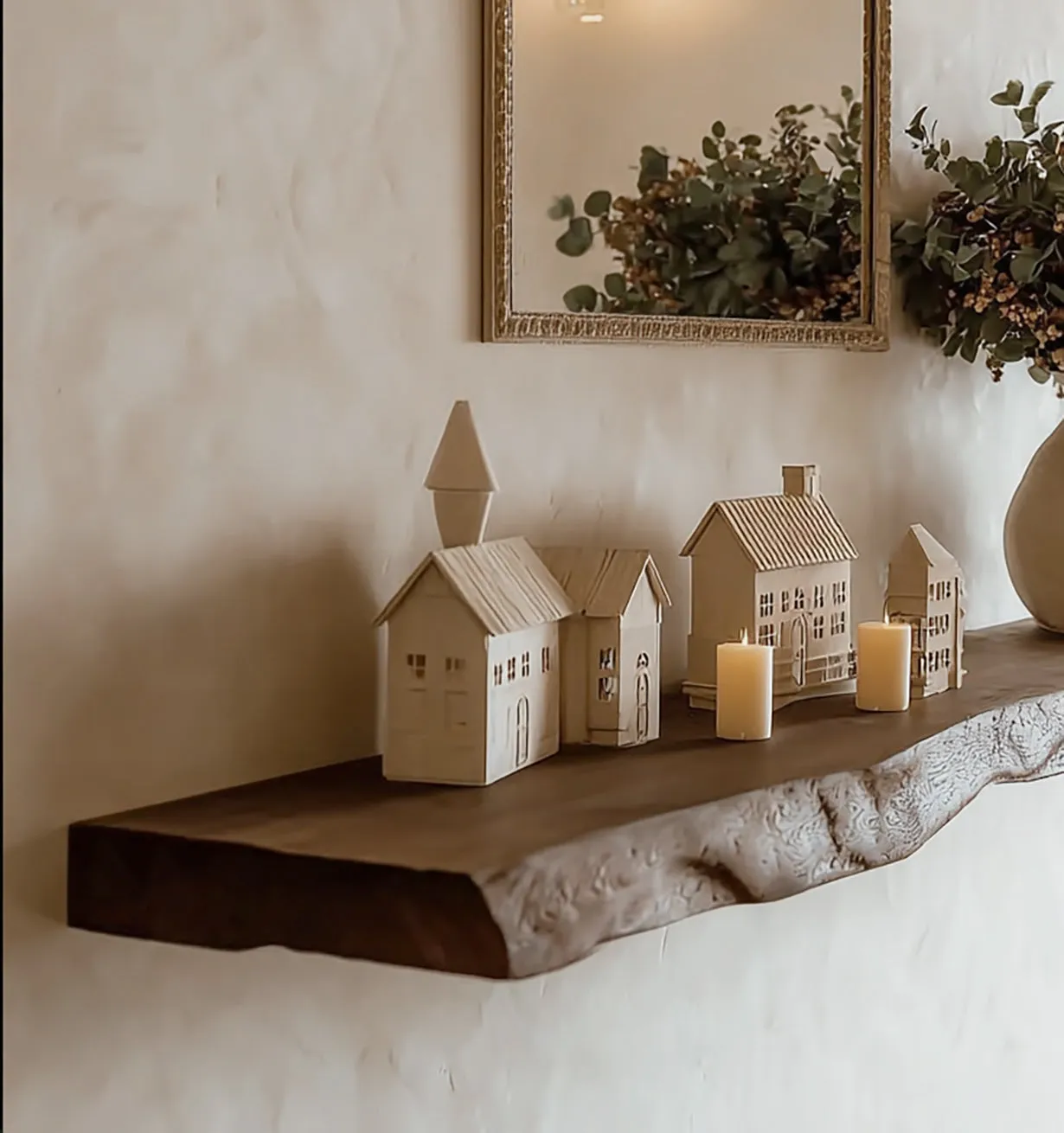 For renters, homeowners, and anyone building a room in layers, this live edge wall shelf offers compact utility and a calming, authentic texture. It frames favorite objects, supports daily routines, and makes a corner feel complete with a single, well chosen element.